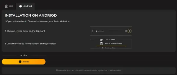 De snelste optie is om je mobiele browser te gebruiken. Open Safari, Chrome of een andere browser, ga naar onze officiële website en speel direct zonder installatie. Als je een app-achtig icoon wilt, kun je onze site aan je startscherm toevoegen wanneer je browser de installatieprompt toont. Dit maakt een PWA-achtige snelkoppeling die opent in een strak venster en dicht in de buurt komt van een Spinstarbet mobiele app, terwijl hij onder de motorkap nog steeds de browser-engine gebruikt.
