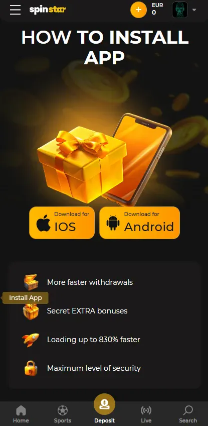 Native apps zijn op dit moment niet beschikbaar: we bieden geen iOS-app aan en we bieden geen Android-app aan. Als je een bestand van derden ziet dat beweert een officiële Spinstarbet apk downloaden te zijn, raden we aan dit te vermijden en alleen onze officiële site te gebruiken. Wanneer mensen zeggen downloaden Spinstarbet app, betekent dat voorlopig op een veilige manier: de snelkoppeling op het startscherm via je browser installeren en via dat icoon inloggen.